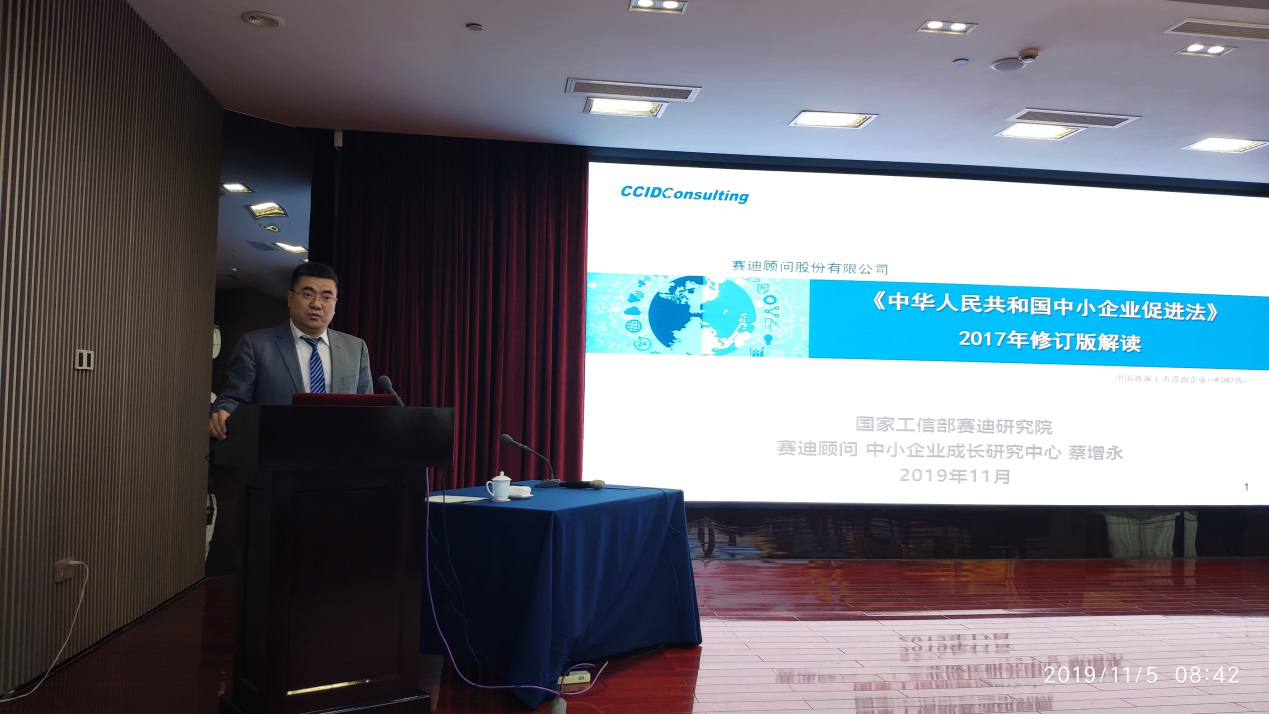 11月5日至6日,省中小企业服务中心在宜昌、襄阳举办政策宣贯暨培训讲座市州行活动。国家工信部赛迪研究院赛迪顾问股份有限公司中小企业成长研究中心副总经理、经济学博士蔡增永,围绕“《中华人民共和国中小企业促进法》2017修订版宣贯”主题,就《中小企业促进法》修法背景与主要内容、新法“五大进步,十大亮点”、立法宗旨解读,从新法的组织架构、标准、资金、创新、创业、市场开拓、权益保护、融资促进、服务措施、统计、监督检查等十一个方面,结合“互联网+制造业、外贸”、普惠金融等大量案例,以活泼生动的形式,向参会的中小企业代表详细讲解了《中华人民共和国中小企业促进法》2017修订版如何促进中小企业发展的主要内容。