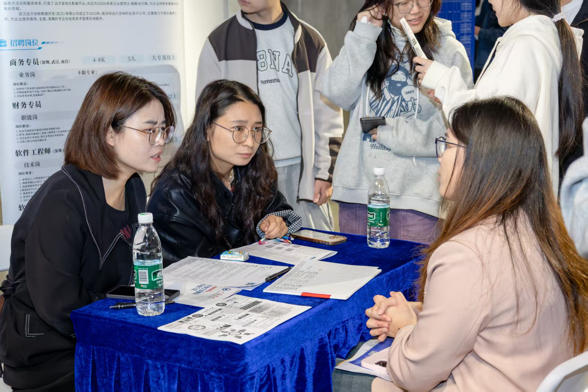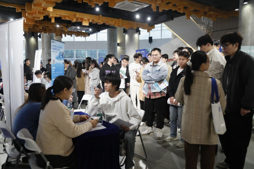 现场,招聘展位呈弧形有序排列,详实的招聘海报、丰富的宣传手册、工作人员的耐心讲解,为学生提供全方位的求职指引,营造出高效、便捷的对接空间。学生们手持简历,自信地穿梭于各企业展位前,就岗位职责、薪资待遇、工作环境与发展前景等问题与招聘代表深入交流。企业招聘人员也主动出击,为驻足观望的学生耐心讲解企业优势与职业路径,助力学子精准匹配岗位和高效投递求职简历。