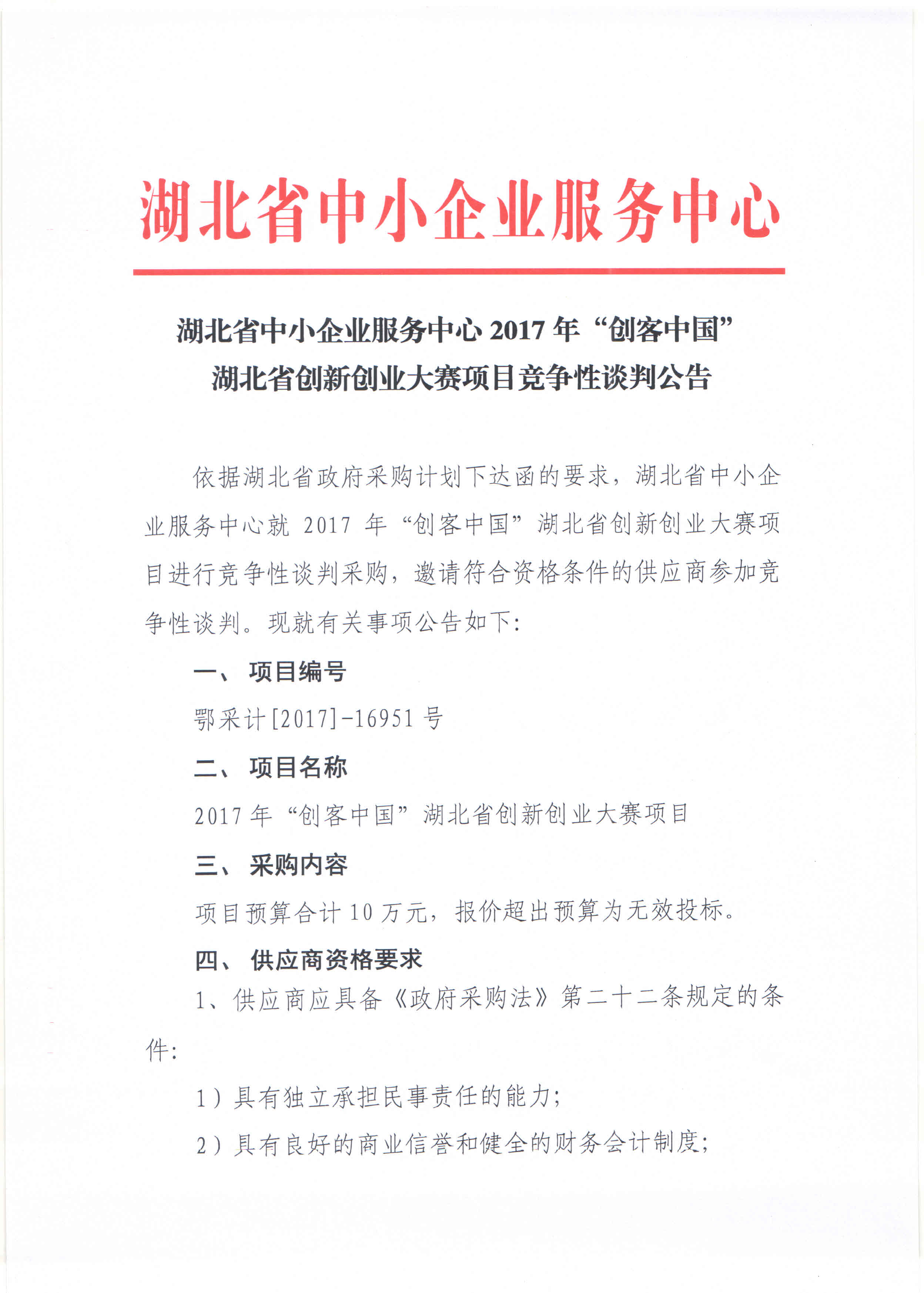 湖北省中小企业服务中心2017年“创客中国”湖北省创新创业大赛项目竞争性谈判公告