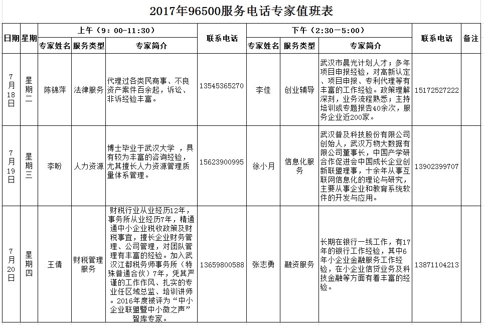 本周继续安排各类专家接听96500热线,分别就创业、融资、人力资源、财税管理、法律和企业信息化等话题,接受创业者咨询。省中小企业公共服务平台提醒,专家接听热线时间为每周二、三、四的上午9时至11时30分,下午2时30分至5时。