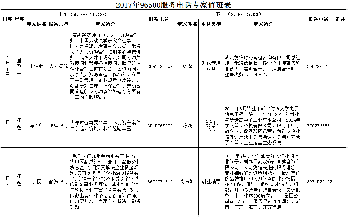 本周继续安排各类专家接听96500热线,分别就创业、融资、人力资源、财税管理、法律和企业信息化等话题,接受创业者咨询。省中小企业公共服务平台提醒,专家接听热线时间为每周二、三、四的上午9时至11时30分,下午2时30分至5时。