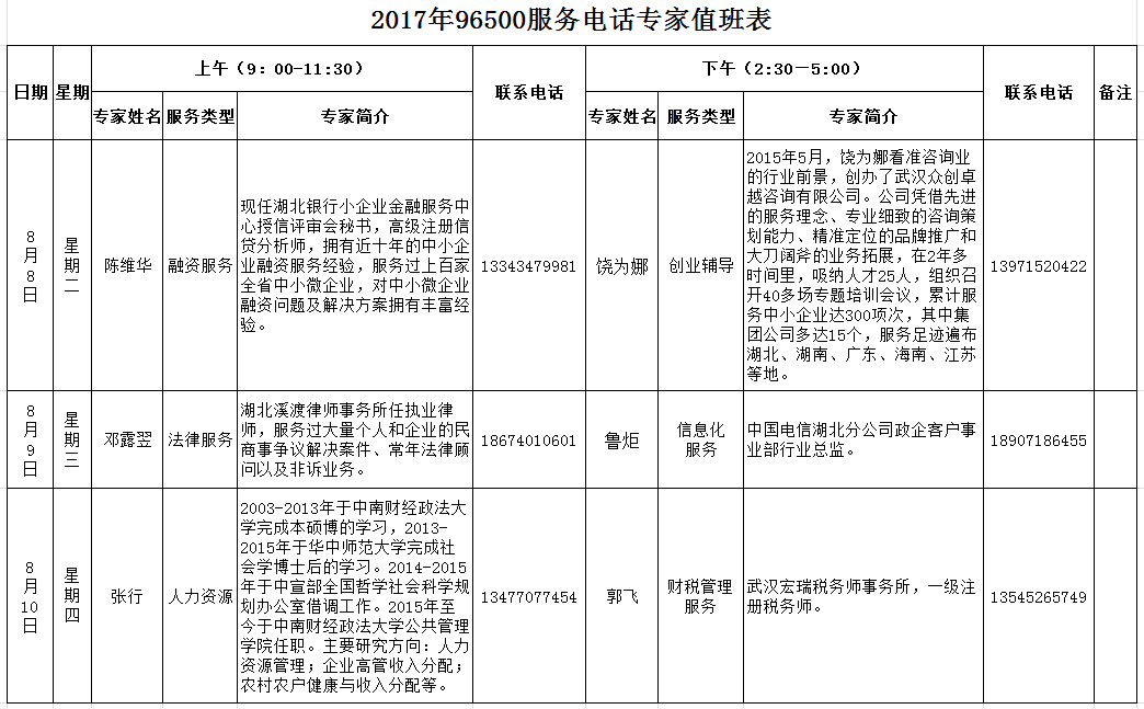 本周继续安排各类专家接听96500热线,分别就创业、融资、人力资源、财税管理、法律和企业信息化等话题,接受创业者咨询。省中小企业公共服务平台提醒,专家接听热线时间为每周二、三、四的上午9时至11时30分,下午2时30分至5时。
