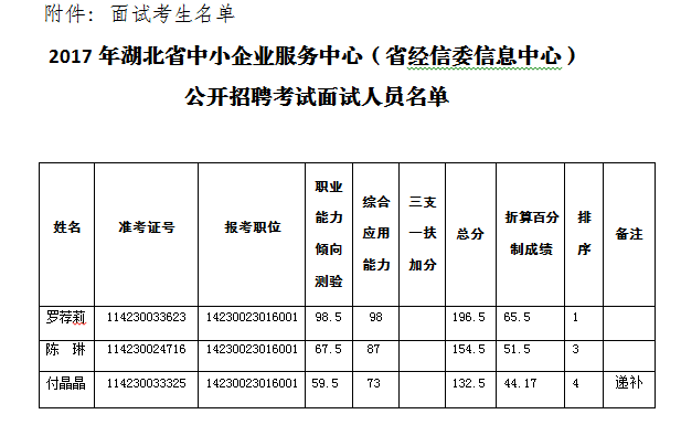 根据《湖北省2017年省直事业单位公开招聘工作人员方案》(鄂人社函〔2017〕280号)的要求,为认真做好2017年省经信委直属事业单位省中小企业服务中心公开招聘工作人员面试工作,现将工作相关事项公告如下: