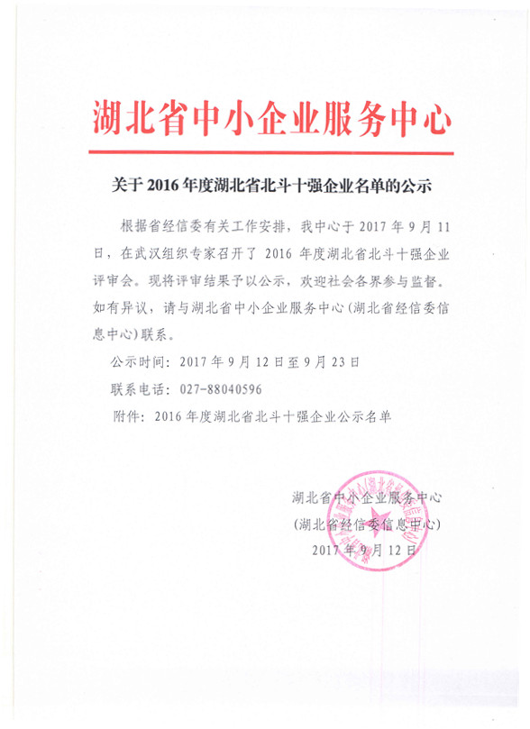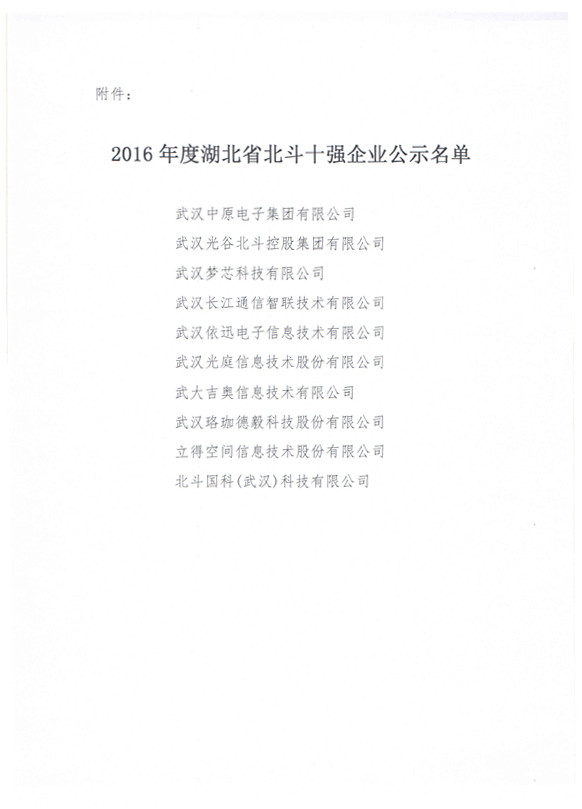 关于2016年度湖北省北斗十强企业名单的公示