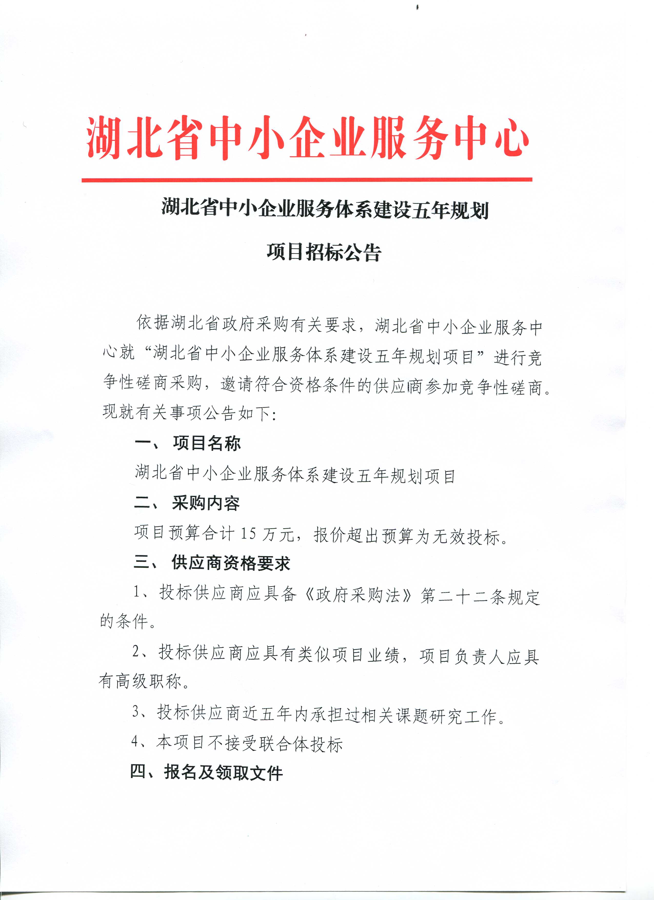 湖北省中小企业服务体系建设五年规划项目招标公告