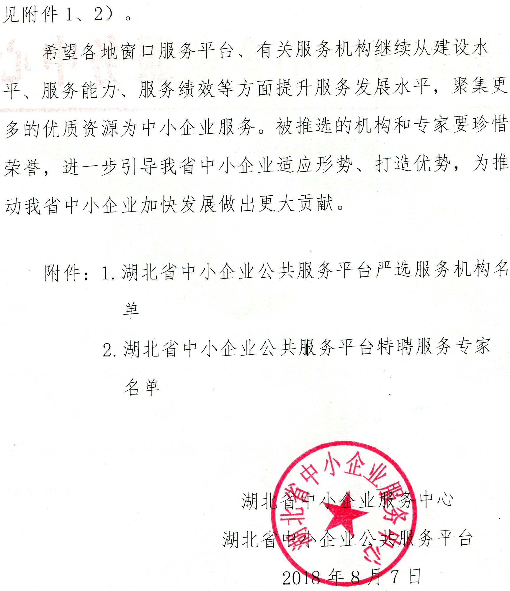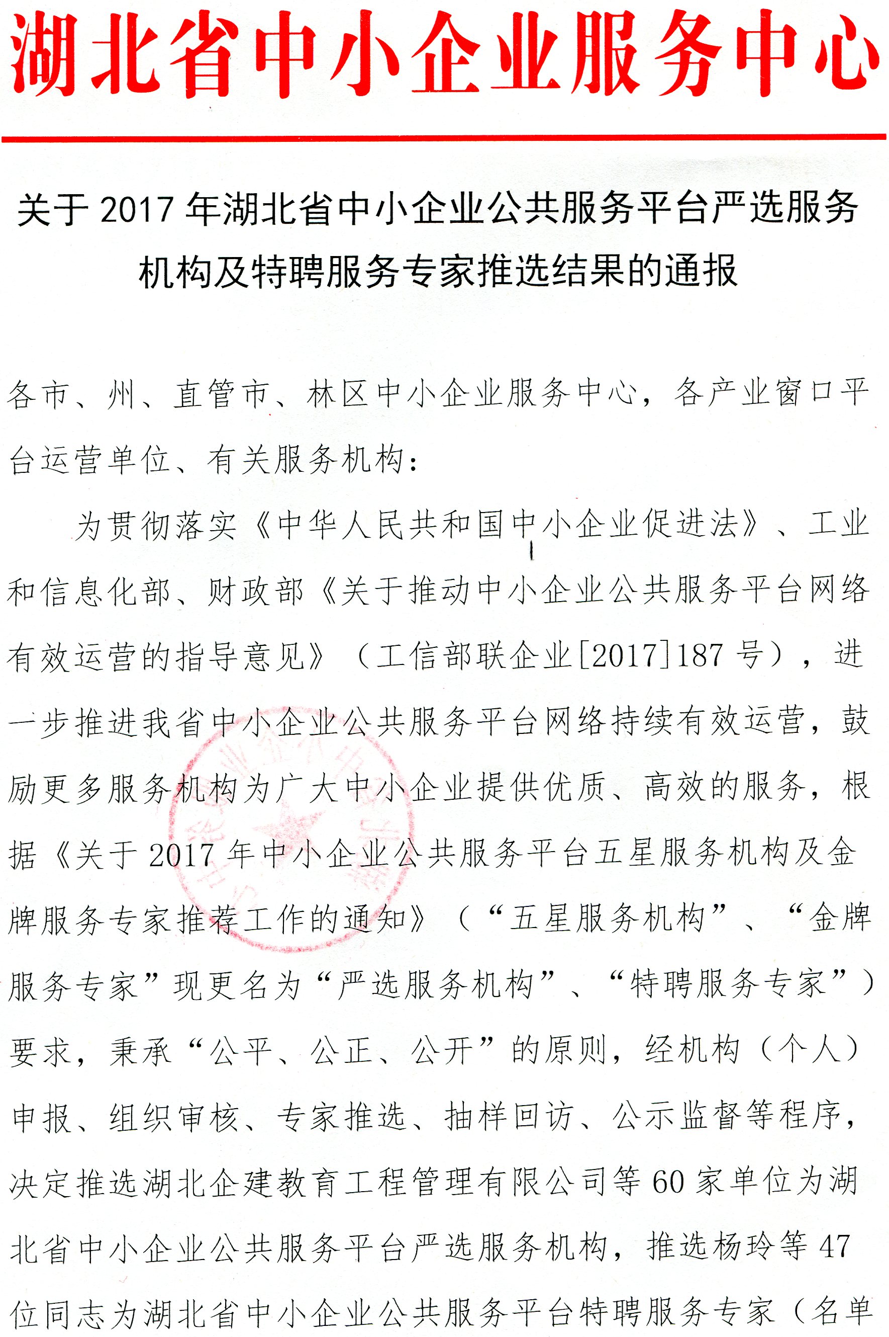 关于2017年湖北省中小企业公共服务平台严选服务机构及特聘服务专家推选结果的通报