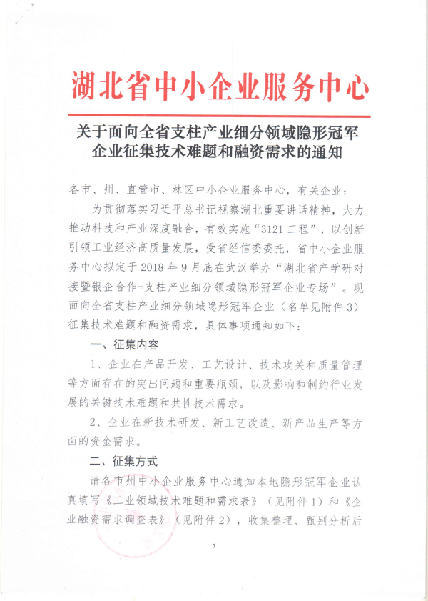 关于面向全省支柱产业细分领域隐形冠军企业征集技术难题和融资需求的通知