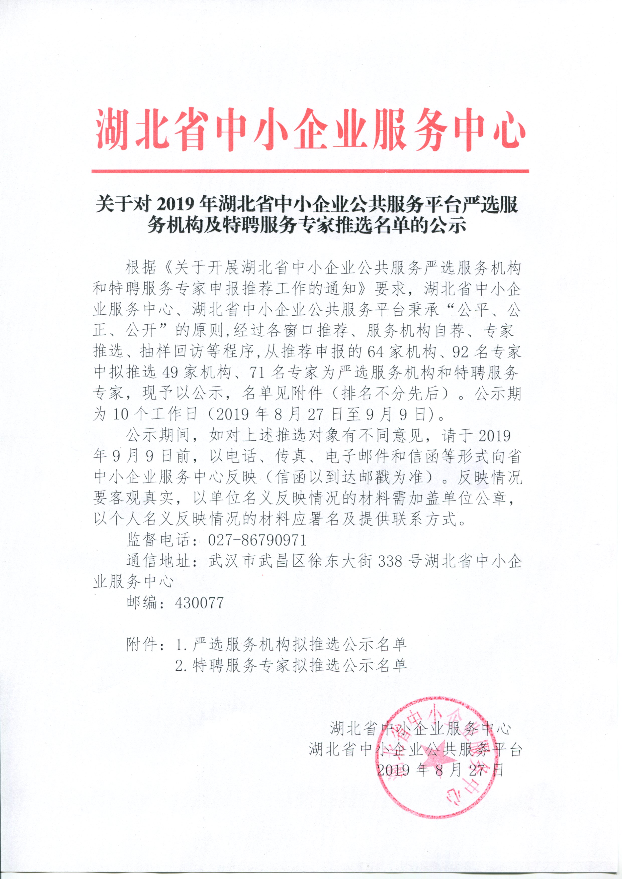 关于对2019年湖北省中小企业公共服务平台严选服务机构及特聘服务专家推选名单的公示
