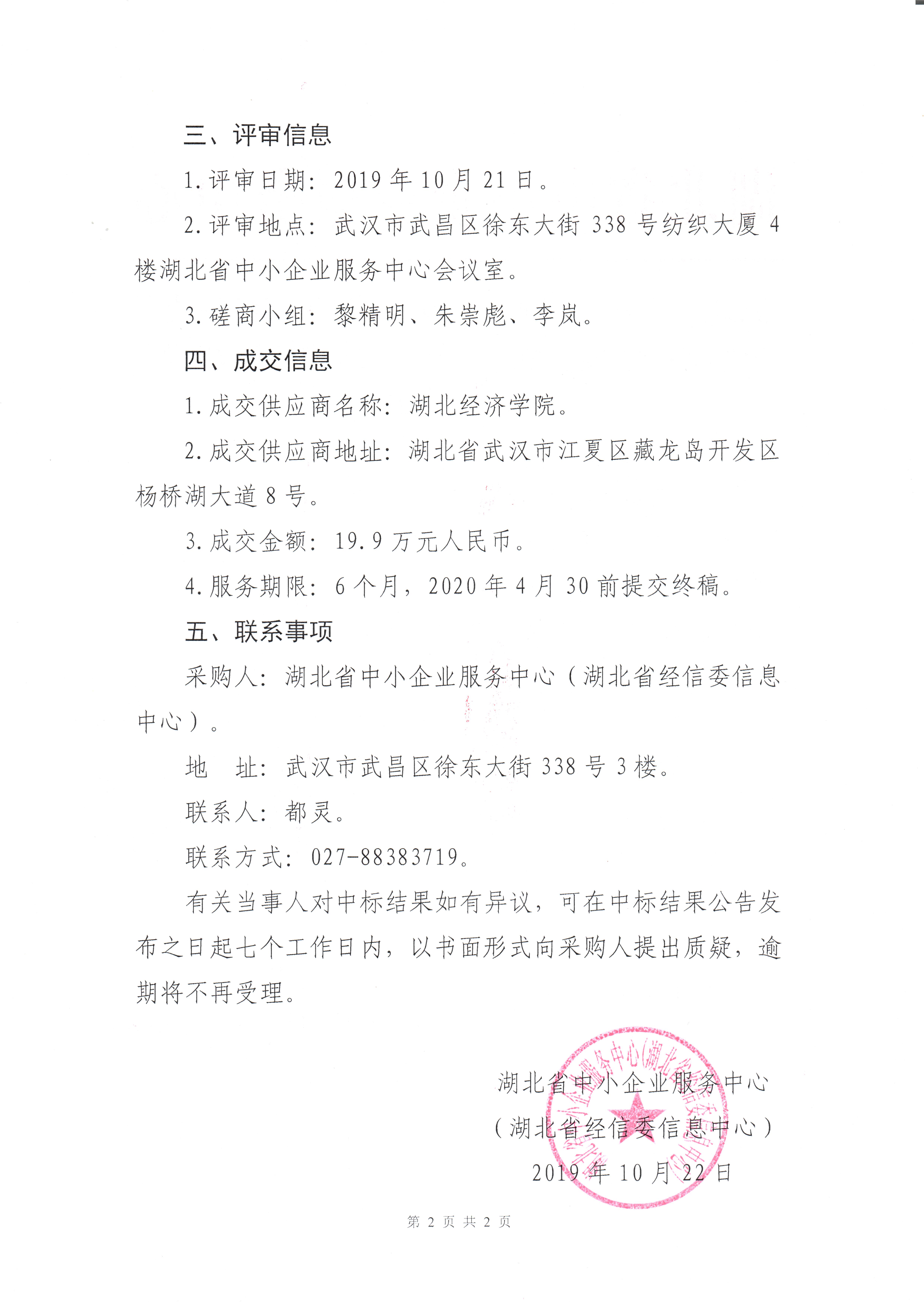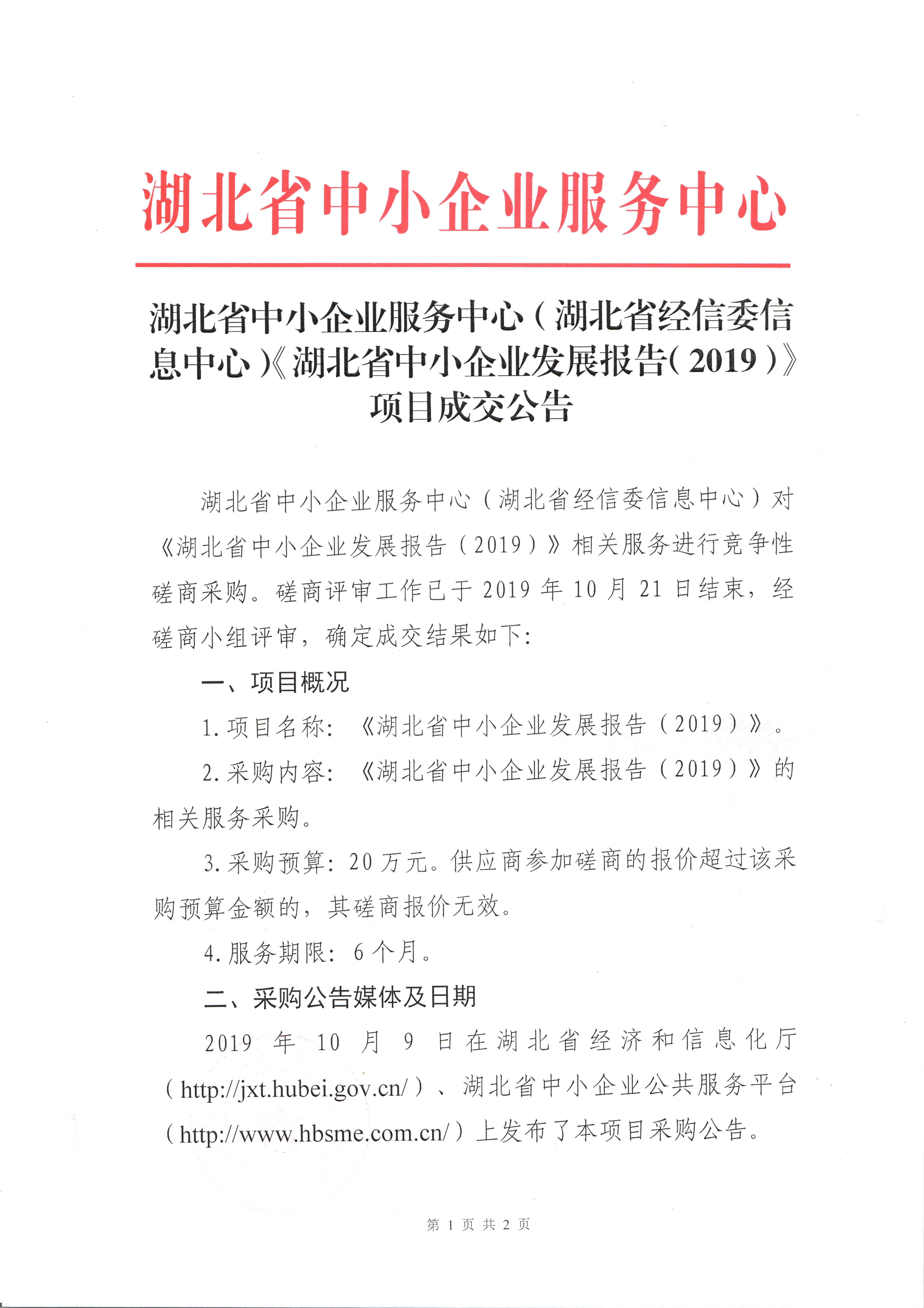 湖北省中小企业服务中心(湖北省经信委信息中心)《湖北省中小企业发展报告(2019)》项目成交公告