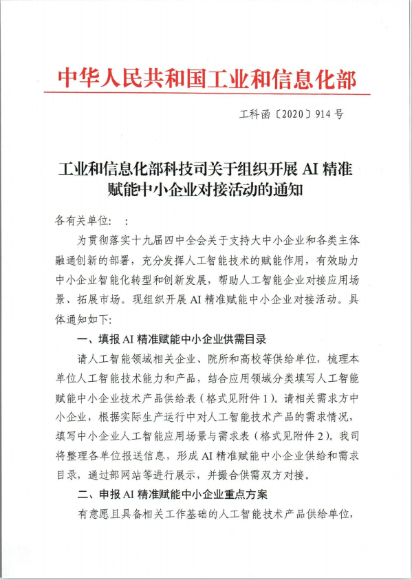 工业和信息化部科技司关于组织开展AI精准赋能中小企业对接活动的通知