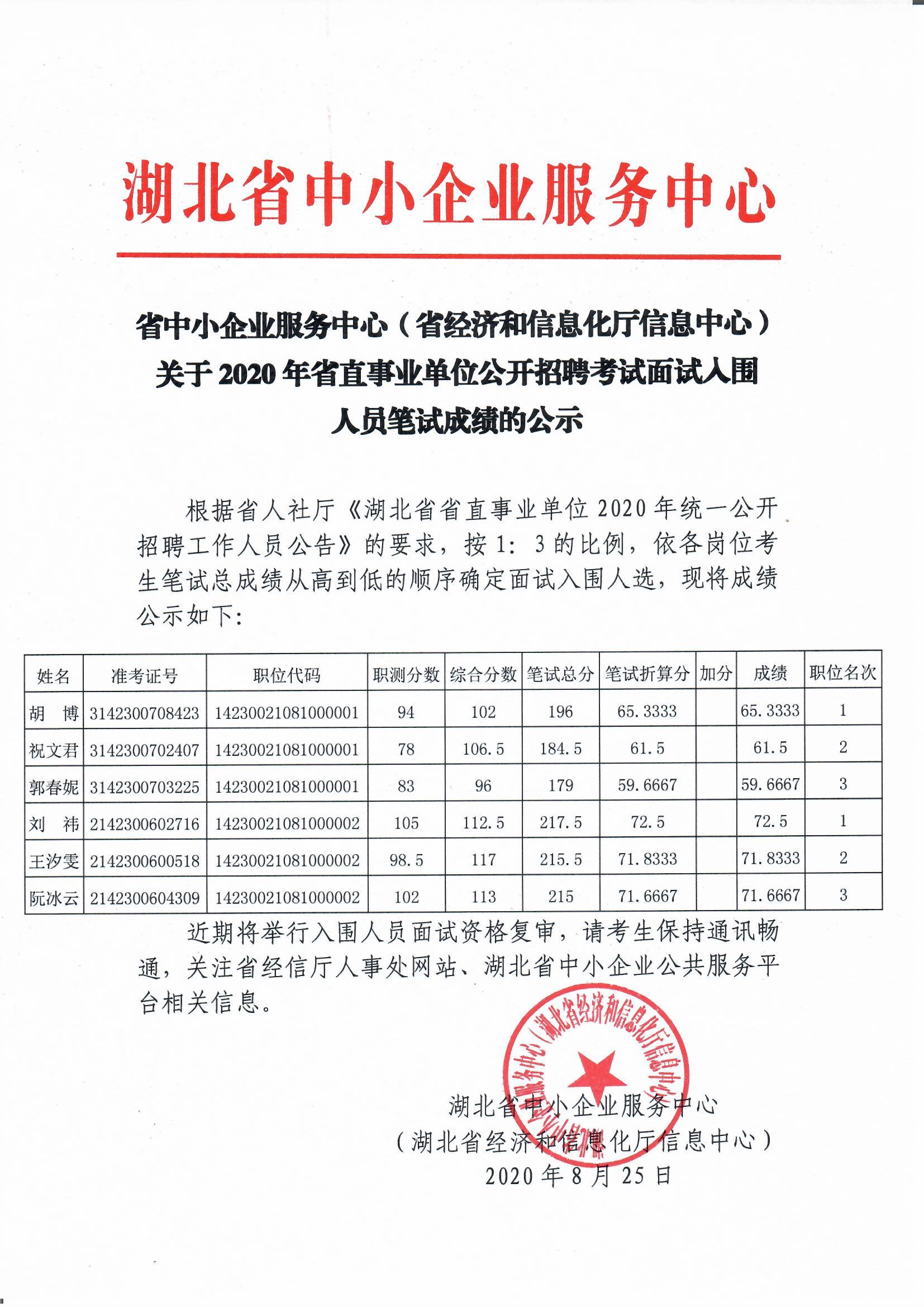省中小企业服务中心(省经济和信息化厅信息中心)关于2020年省直事业单位公开招聘考试面试入围人员笔试成绩的公示